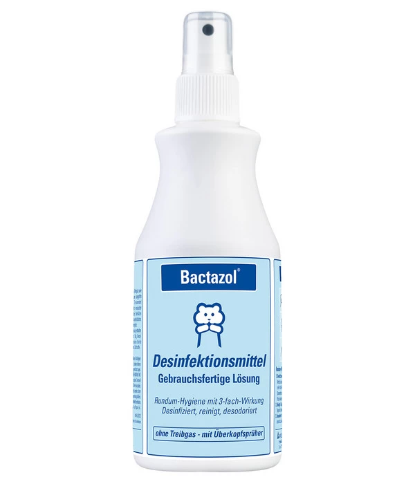 Die Rundumhygiene für Haushalt und Kleintierhaltung: Gebrauchsfertige Lösung zum Aufsprühen mit Dreifach-Wirkung – Bactazol® Desinfektionsmittel desinfiziert, reinigt und beseitigt unangenehme Gerüche. Das Desinfektionsspay von Bactazol® desinfiziert Haushalt, Möbel, Tierbehausungen und die Umgebung von Mensch und Tier. Das Besprühen mit Bactazol® Desinfektionsmittel wirkt bakterizid gegen Erreger bakterieller Infektionen wie z. B. Salmonellen und Coli-Keime (Darmerkrankungen) und fungizid gegen Pilzerkrankungs-Erreger wie z. B. Aspergillus-Trichothyton-Arten. Der praktische Spraykopf erlaubt eine genaue Dosierung. Zum Reinigen einfach die betreffenden Flächen von Käfig, Voliere, Stall oder sonstigen Tierbehausen wie Katzentoiletten etc.sowie auf Oberflächen von Möbel und Teppichböden auftragen, einwirken lassen und wieder abwischen. Bei regelmäßiger Anwendung wirkt dieses Desinfektionsspray auch vorbeugend gegen Parasiten und Insekten. Das Bactazol® Desinfektionsmittel hat zudem eine desodorierende Wirkung und hinterlässt eine aromatische Frische in Ihrer Umgebung.