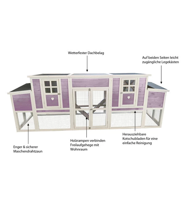 Sie wollen frisch gelegte Eier zum Sonntagsfrühstück genießen und deswegen eigene Hühner in Ihrem Garten halten? Dann ist der Hühnerstall Happy Farm Henriette von Dehner die ideale Behausung, um die Tiere komfortabel zu beherbergen. Durch den engen Maschendraht sind Ihre gefiederten Freunde optimal vor Feinden im Freiluftbereich gesichert, sodass Sie immer mit einem guten Gefühl nach draußen schauen können. Das werden Sie auch gerne tun, denn dieser farbenfrohe Stall ist ein echter Hingucker. Der fröhliche Farbton und die hübschen Verzierungen ziehen die Blicke Ihrer Gartenbesucher magisch an, sodass Ihre Hühner immer in bester Gesellschaft sind. In der Mitte des Stalls befindet sich eine Holzstange, auf der Ihre Hühner stehen können. Zudem sind beide Rückzugshäuser mit einer bequemen Sitzstange versehen.