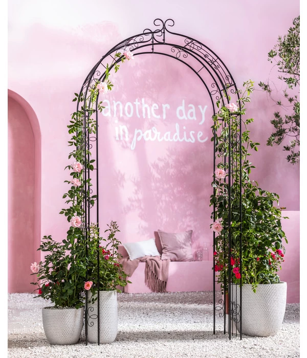 Ein mit prächtigen Kletterrosen bedeckter Rosenbogen weckt in jedem Gartenliebhaber eine romantische Ader. Vielleicht denken auch Sie beim Anblick des reich verzierten Rosenbogens Belmont von Dehner an alte Schlossparks, in denen Damen mit langen Rüschenkleidern und koketten Sonnenschirmchen mit formell gekleideten Gentlemen flanierten und man sich zum heimlichen Tête-à-Tête in den Rosengarten zurückzog, den man natürlich durch einen über und über mit Blüten bedeckten Rosenbogen betrat. Das Modell Belmont von Dehner steht ganz in der Tradition solcher nach alter Schmiedekunst hergestellten Rosenbögen und ist mit ebenso zierlichen Details verziert. Und was das Beste ist: Der Rosenbogen Belmont von Dehner braucht keinen Schlosspark, um seine dekorative Wirkung zu entfalten, sondern stellt sich auch in einem modernen Privatgarten wie Ihrem gerne zur Schau. Machen Sie noch heute Ihren lang gehegten Traum wahr und lassen Sie ein bisschen Romantik-Feeling in Ihren Garten einziehen – mit dem Rosenbogen Belmont von Dehner und seinen imposanten Kletterrosen!