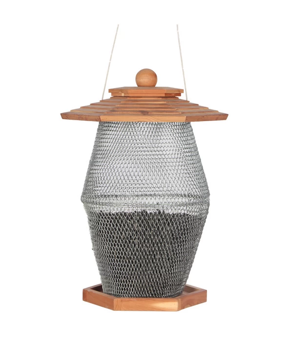 Sie möchten den heimischen Vogelarten gern ein schönes Plätzchen bieten, an dem es gutes Futter zu holen gibt? Dann ist die Natura Futterlaterne Andorra die richtige Wahl. Die einfache Aufhängevorrichtung der Laterne ermöglicht eine einfache Befestigung – beispielsweise an einem Ast. Ein optischer Hingucker ist die dekorative Laterne aus Zedernholz und Metall in jeder Jahreszeit: sie ist witterungsbeständig und kann ganzjährig eingesetzt werden. Die Laterne eignet sich für alle Arten von Streufutter und lässt sich über die Deckeloberseite spielend leicht befüllen.