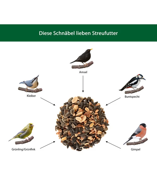 Mit unserem Dehner Natura Streufutter bieten Sie Ihren freilebenden Gartenvögeln ein schmackhaftes, energiereiches Hauptfutter. Vor allem in der kälteren Jahreszeit benötigen Wildvögel bei der Suche nach Futter die Unterstützung des Menschen. Unser Dehner Natura Streufutter besteht aus ausgesuchten, hochwertigen Zutaten und zeichnet sich durch besonders hervorragende Qualität aus.