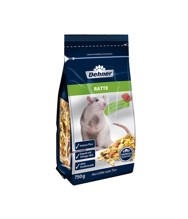 Das Dehner Premium Rattenfutter mit seiner prebiotischen Futtermischung in Dehner Premium-Qualität bietet die beste Rundumversorgung für Ihre Nager. Hergestellt wird das ausgewogene Futter für Ratten aus ausgewählten Rohstoffen und die natürliche Prebiotika im Futter haben zwei wesentliche Mechanismen. Die enthaltenen Mannane können von negativen Darmbakterien nicht verwertet werden und bieten daher nur den erwünschten Keimen im Darm eine gute Nahrungsgrundlage. So kann sich eine positive und ausgeglichene Darmflora entwickeln. Pflanzliche Beta-Glucane im Futter für Ratten stabilisieren und fördern die körpereigenen Abwehrkräfte, indem sie das Immunsystem Ihrer Ratten stimulieren. Die Darmbewegung und -pflege wird außerdem durch den hohen Rohfaseranteil in der Futtermischung für Ratten unterstützt. Weitere ausgesuchte Zutaten im schmackhaften Futtermix wie Rapsöl enthalten wertvolle essentielle Omega-3- und Omega-6-Fettsäuren und wirken sich so positiv auf die Gesundheit von Haut und Fell aus. Zudem wurde auf einen ausbalancierten Calciumgehalt im Dehner Premium Rattenfutter geachtet, da dieses Mineral für das Wachstum von Knochen und Zähnen wichtig ist. Eine weitere Grundlage für die abgestimmte und gesunde Ernährung von Ihren Nagern sind die Verwendung von zuckerarmen Zutaten und artgerechtem Gemüse. Für die Zufuhr von tierischem Eiweiß sorgen die enthaltenen Mehlwürmer und die Erweiterung der abwechslungsreichen Zutatenliste. Mit dem hochwertigen und ausgewogenen Futtermix werden Ihre Ratten mit allen wichtigen Vitaminen, Nährstoffen und Spurenelementen versorgt. Selbstverständlich wird bei der Herstellung der Dehner Premium prebiotischen Vitalkost auf Farb-, Aroma- und Konservierungsstoffe sowie Zuckerzusatz verzichtet. Verwöhnen Sie Ihre Ratten mit diesem leckeren Futter in Premium-Qualität. Durch den wiederverschließbaren Beutel bleibt das Dehner Premium Rattenfutter auch nach dem Öffnen lange frisch.