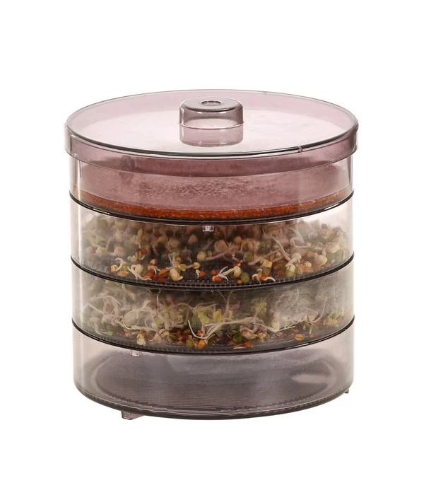 In einer Keimsprosse steckt die gebündelte Kraft des Samenkorns. Die Keimlinge von Radieschen, Bockshornklee und Co. sind sehr wohlschmeckend und bereichern unsere Speisen mit vielen gesunden Nährstoffen. Sie im Supermarkt zu kaufen ist eher lästig, deren Frische oft zweifelhaft. Wer hingegen ein Dehner Sprossenhaus besitzt, kann sich stets absolut frisch und bequem bedienen, wenn Salat oder Gemüse mit den köstlichen Keimen aufgepeppt werden sollen. Es verfügt über 4 geräumige Schalen, die sich aufeinander stapeln lassen. Die Anzahl der Schalen kann je nach Belieben geändert werden. Der Deckel sorgt fürs passende Treibhausklima und die unterste Schale fängt überschüssiges Wasser auf, damit es entsorgt werden kann. Das Dehner Sprossenhaus wurde aus hochwertigem, klarem Kunststoff gefertigt und kann zur Reinigung sogar in die Spülmaschine. Außerdem ist sie frei von Bishphenol A.