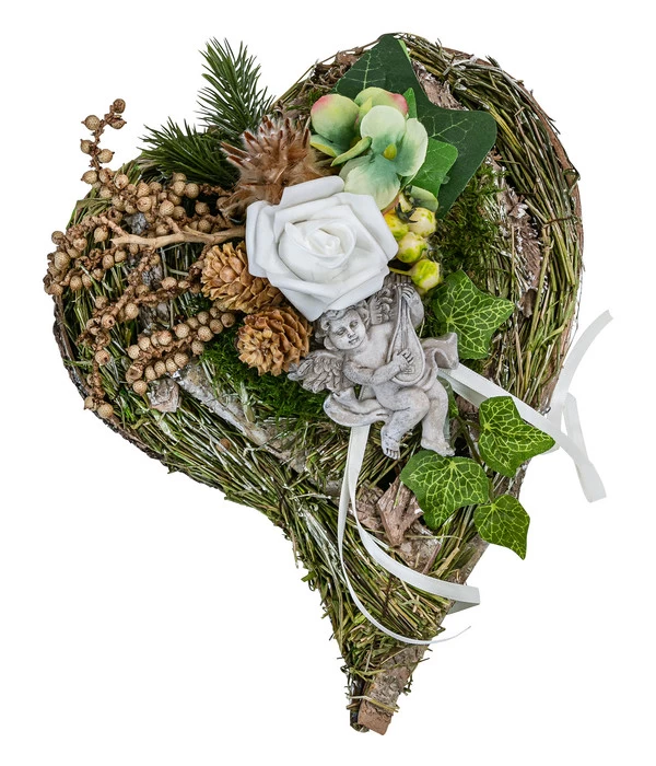 Perth besticht aber nicht nur mit seiner herzförmigen Optik und der schlichten Eleganz, das Gesteck hat eine wunderschöne weiße Seidenrose als Blickfang in seiner Mitte. Klassisch steht die weiße Rose für die Liebe und Treue, mit diesem Gesteck lässt sich daher wunderbar Ihre ewige Verbundenheit zu den Verstorbenen ausdrücken, ganz ohne Worte. Geschmückt wurde das pietätvolle Gesteck zudem mit einem niedlichen Engel aus wetterfestem Polyresin. Die Himmelsfigur spielt Mandoline und schafft eine trostspendende Atmosphäre. Lassen Sie Symbole sprechen und zieren Sie mit Perth kleinere Grabstätten oder Urnengräber.