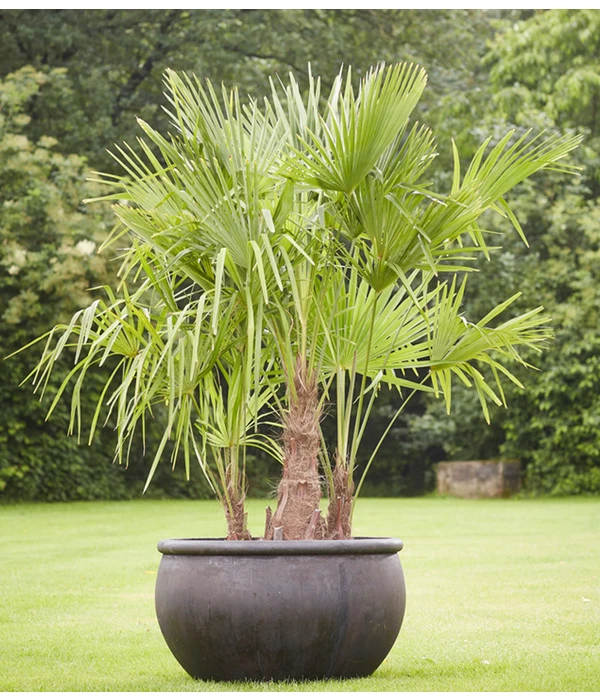 Nicht immer müssen exotische Schönheiten zugleich Mimosen sein. Mit der Hanfpalme können wir Ihnen eine der robustesten und frosthärtesten Palmen weltweit vorstellen. Heimisch ist diese im Norden Indiens bis Nordthailand und China, weshalb sie auch den Namen Chinesische Hanfpalme trägt. Im europäischen Raum begegnet man ihr in südlichen Gefilden mit mildem Klima, in mediterranen Gärten wie in Italien oder im Tessin in der Schweiz. Auch bei uns kann diese Palmenschönheit auf reizvolle Weise Gärten und Terrassen mit exotischen Flair verzaubern. Mit ihrer charakteristischen Optik – den fächerartigen Blättern, die vom Kopf aus nach oben austreiben und sich im zunehmenden Alter senken – braucht sie ausreichend Platz, um sich gut entfalten zu können. Da die einzelnen Stämme der Hanfpalme unterschiedlich groß sind, und dadurch ein buschiger und dichter Aufbau entsteht, wird die Palme zudem zum idealen Sichtschutz auf Terrasse oder Balkon.