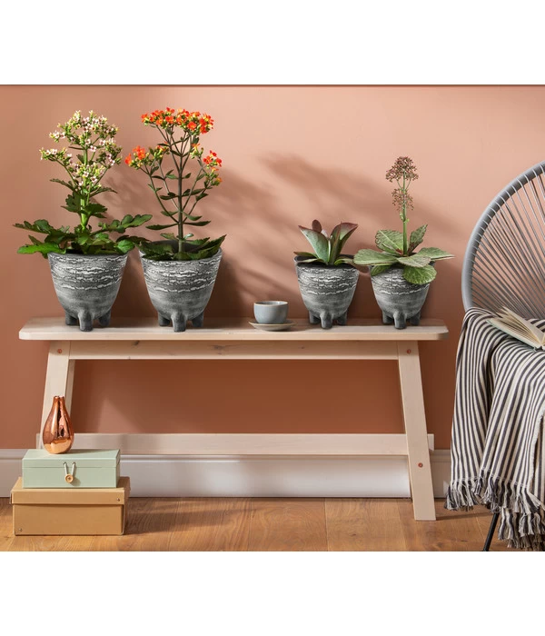 Eine wahre Freude für Blumenfreunde ist die Kalanchoe, denn neben dem Flammendem Käthchen gibt es noch viele weitere interessante Arten, wie z.B. die Sorte ‚Desert Surprise‘. Ein Blickfang ist vor allem das gekerbte, graugrüne Laub, welches violett getigert ist. Auch die kurzstieligen Blütendolden, die kleine grün-purpurrote Blüten zeigen, tragen zum Ziewert der Zimmerpflanze bei. Auch wenn der exotische Anblick der Kalanchoe ‚Desert Surprise‘ vermuten lässt, das hier ein grüner Daumen erforderlich ist, so können sich nun ungeübte Pflanzenfreunde freuen. Die Sukkulente aus der Familie der Dickblattgewächse zeigt sich als äußerst genügsam und gedeiht prächtig bei wenig Pflege.