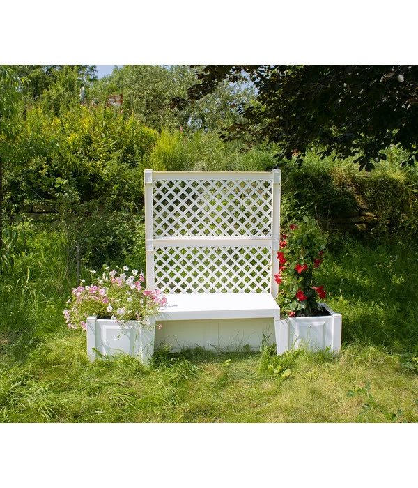 Die KHW Kunststoff-Gartenbank Kopenhagen ist eine stabile und formschöne Gartenbank, die jeden Garten um einiges romantischer und stilvoller macht. Das Set beinhaltet außerdem zwei Pflanzkästen, die Sie individuell mit Ihren Lieblingsblumen befüllen können, und einen Spalier. Damit eignet sich die Gartenbank auch optimal als stimmungsvolle Trennung zwischen zwei Gartenabschnitten oder als besonderer Hingucker in der Mitte Ihrer Grünfläche. Ihre Gäste werden Augen machen! Die Lieferung der KHW Kunststoff-Gartenbank Kopenhagen erfolgt in Einzelteilen, die sich aber einfach und ohne zusätzliches Werkzeug montieren lassen.