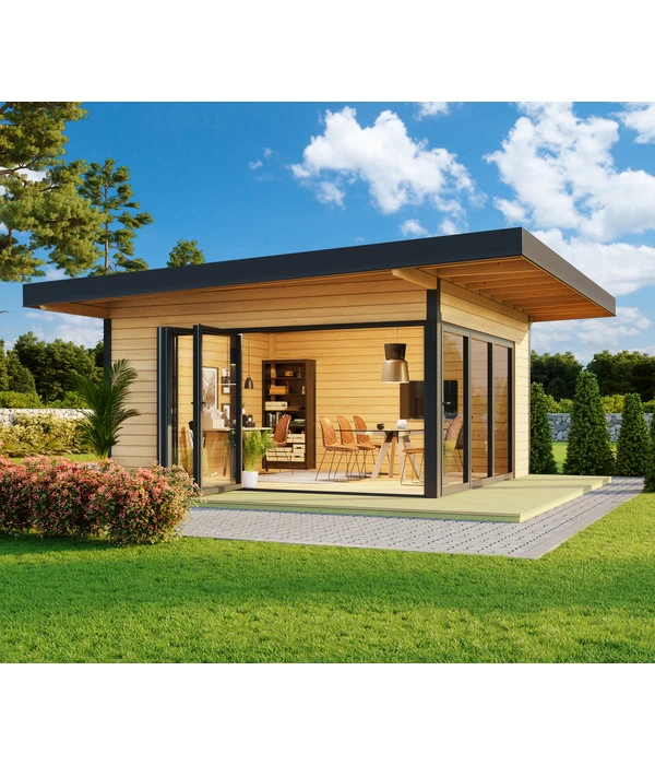 Wow! Was Sie hier gerade entdeckt haben lässt Sie über Holzgartenhäuser plötzlich ganz anders denken. Das ist verständlich. Denn wenn von einem Gartenhaus die Rede ist, denken die meisten von uns an eine rustikale, leicht verspielte Holzhütte mit Satteldach. Genau das Gegenteil trifft auf das Lasita Maja Blockbohlenhaus Cortina zu. Denn dieses Gartenhaus erinnert eher an den stylischen Entwurf eines Stararchitekten. Gekonnt aus kubischen Formen komponiert zieht es alle Blicke auf sich. Es begeistert mit einem imposanten Dachüberstand, der im spannenden Kontrast zur großflächigen Fensterfront steht. Die dunkle Dachverblendung und die Fensterrahmen setzen reizvolle Akzente auf dem hellen Korpus aus naturbelassener Fichte. Besser können Sie die ca. 19 m² in Ihrem Gartengrundstück kaum nutzen! Worauf also warten? Beschenken Sie sich mit einem Lasita Maja Blockbohlenhaus Cortina!
