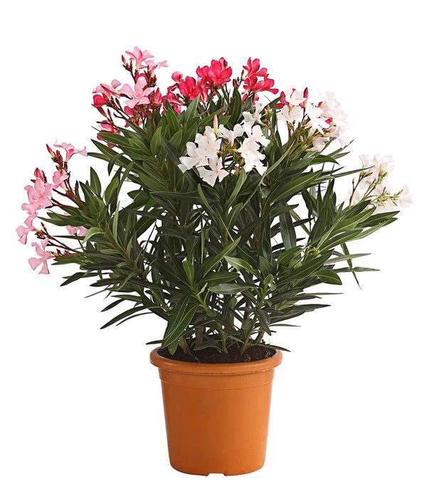 Wer gerne in den Mittelmeerraum reist, wird sich über kurz oder lang unsterblich in ihn verlieben – nein, in keinen Latin Lover, sondern in einen Oleanderbusch! Denn wie kaum eine andere Pflanze stellt dieser mediterrane Strauch eine Blütenfülle zur Schau, die seinesgleichen sucht. In seiner Heimat kann ein Oleander mehrere Meter hoch werden und ganze Straßenzüge begrünen. Und das von Mai bis Oktober. Sie haben schon öfter mit dem Gedanken gespielt, Ihren Outdoor-Bereich mit einem Oleander zu bereichern, konnten sich aber bisher für keine Farbe entscheiden? Rosa, gelb, weiß, kirschrot – eine Farbe ist so schön wie die andere? Dann nehmen Sie doch diese tolle Oleander-Züchtung, auf der drei Blütenfarben um die Wette blühen und von einem kräftig buschigen Wuchs und einem wohlriechenden Duft begleitet werden!