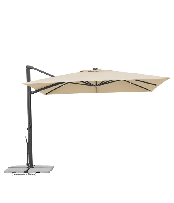 Der Schneider Ampelschirm Rhodos Smart hat ein anthrazitfarbenes, pulverbeschichtetes Gestell aus Aluminium, sodass Sie es unbesorgt draußen im Freien stehen lassen können. Der Sonnenschirm ist außerdem mit einem Kurbelsystem ausgestattet, das Ihnen komfortables und leichtes Öffnen und Schließen des Schirmes erlaubt. Durch Betätigung des Handhebels am Drehgelenk lässt sich der Schirm um 360° drehen, um Ihnen ohne viel Aufwand optimalen Schutz bei fast jeder Sonnenstellung zu geben. Im Lieferumfang zum Schneider Ampelschirm Rhodos Smart ist außerdem ein Plattenständer für 4 Wegeplatten der Größe 50 x 50 cm enthalten, der dem Schirm einen stabilen Stand gibt. Sie müssen also nur die Wegeplatten besorgen und schon ist der Sonnenschirm einsatzbereit.