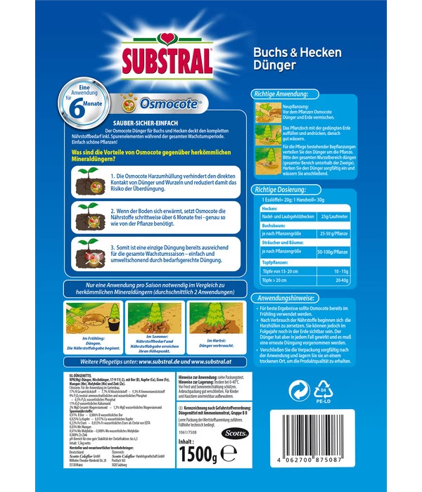 Ganz gleich, ob es um eine dichte Hecke geht, die aus Ihrem Grundstück eine private Rückzugsoase macht oder um sattgrüne Buchskugeln und andere immergrüne Ziersträucher in Töpfen und Beeten – ohne die richtigen Nährstoffe wird keine Pflanze in der Lage sein, Ihre Erwartungen zur vollsten Zufriedenheit zu erfüllen. Eine optimale Unterstützung bieten Sie Ihren Pflanzen mit dem Substral® Osmocote® Buchs & Hecken Dünger. Der Substral® Osmocote® Buchs & Hecken Dünger ist nämlich ein hochwertiger Langzeitdünger, der die Nährstoffe über einen Zeitraum von 6 Monaten langsam und bedarfsgerecht an die Pflanzen abgibt, abhängig von Bodentemperatur und Wasserversorgung. Außerdem verhindert die spezielle Osmocote®-Umhüllung den direkten Kontakt zwischen Düngemittel und Pflanzenwurzeln, so dass auch eine gefährliche Überdüngung ausgeschlossen ist. Deshalb brauchen Sie den Substral® Osmocote® Buchs & Hecken Dünger auch nur 1 x pro Saison anzuwenden, um Ihre Pflanzen optimal mit allem zu versorgen, was sie brauchen.