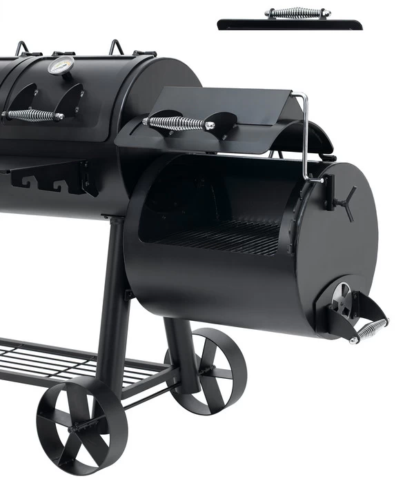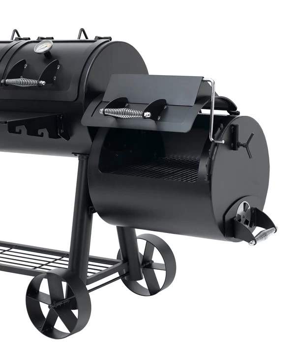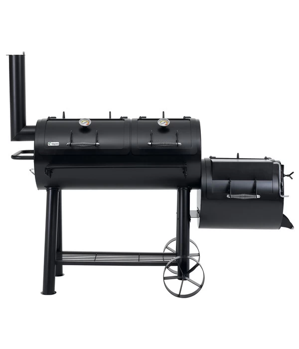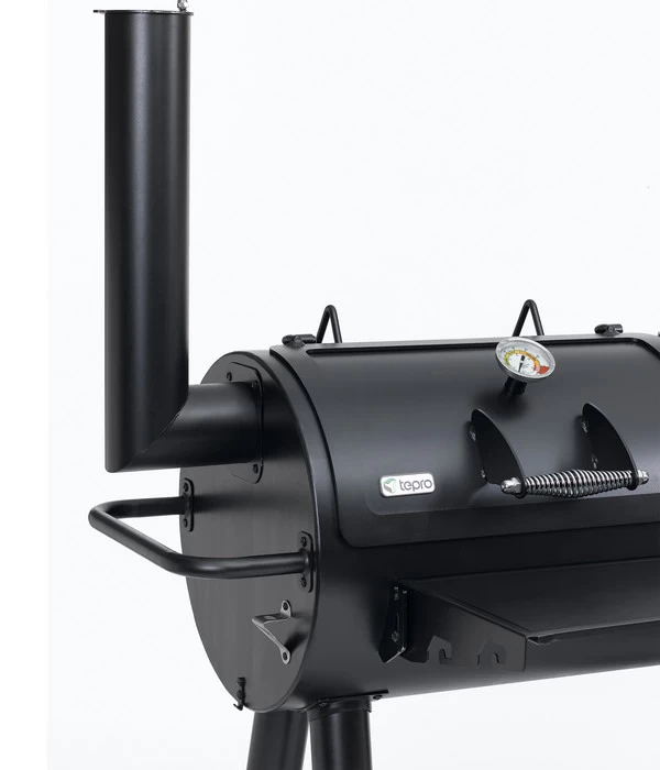 Mit dem Massiv Smoker Indianapolis der Marke tepro können Sie ganz nach Wunsch auf die traditionelle Art grillen oder sich für neuartige Grillmethoden entscheiden. Die zweigeteilte Hauptbrennkammer mit separaten Stahldeckeln und Deckelthermometern ermöglicht die Zubereitung des Grillgutes direkt über der Glut oder im aromatischen Rauch eines Holzfeuers. Diese Methode des Räucherns sollten Sie unbedingt ausprobieren! Das Fleisch wird hierbei durch die aufsteigende Abluft, die beim Verbrennen des Holzes entsteht, besonders schonend gegart. So entsteht der typische, würzige Rauchgeschmack, der bei Kennern so beliebt ist.
