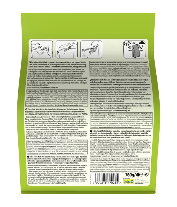 Mit dem Tetra Pond Multi Mix bekommen Sie eine ganz spezielle Mischung für Ihre Fische. Das Mischfutter besteht aus den besten Flocken, Sticks, Wafern und schmackhaften Gammaruskrebsen. Dank des Tetra Pond Multi Mix werden Sie allen Fressgewohnheiten aller Fische in Ihrem Gartenteich gerecht und keiner kommt zu kurz.