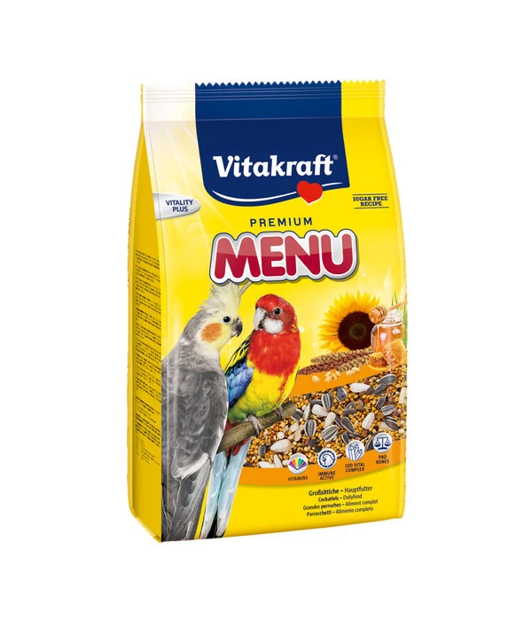 Das auf Basis jahrzehntelanger Erfahrung entwickelte Vitakraft Premium Menü mit Honig ist ein artgerechtes und ausgewogenes Hauptfutter für alle Großsittiche, das nicht nur schmackhaft ist, sondern auch alles liefert, was für ein gesundes Leben benötigt wird. Mit hochwertigen Saaten, leckeren Nüssen und sonnengereiftem Getreide ist diese schmackhafte Mischung optimal auf die Bedürfnisse Ihrer Großsittiche abgestimmt. Bei der idealen Versorgung der Tiere helfen lebenswichtige Vitamine, Mineralien und Spurenelemente. Abgerundet wird die Rezeptur des Vitakraft Premium Manü Hauptfutters mit wertvollem Honig. Der bewährte Jod Vital Komplex beugt Mangelerscheinungen vor und sorgt für einen Extra-Schub an Vitalität. Der ideal abgestimmte Gehalt an Vitaminen fördert das Wohlbefinden und die Beta-Glucane stärken die Abwehrkräfte Ihrer Großsittiche. Das optimale Calcium-Phosphor-Verhältnis unterstützt außerdem einen gesunden Knochenbau. Dieses im wiederverschließbarem Aroma-Fresh-Bag erhältliche Vitakraft Premium Menü mit Honig wurde nach zuckerfreier Rezeptur zusammengestellt und sorgt bei Ihren Großsittichen ohne künstliche Farb-. Konservierungs- und Aromastoffe für eine gesunde, abwechslungsreiche und artgerechte Mahlzeit.
