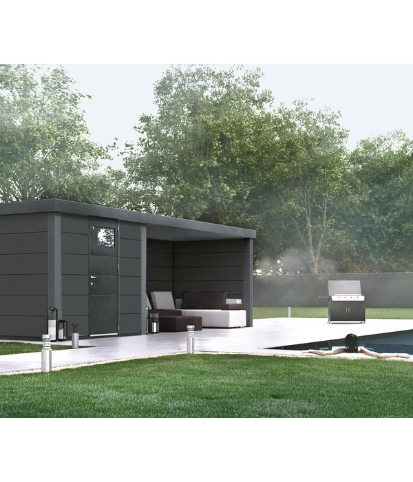 In Ihrem Garten ist noch Platz für Träume oder auf Ihrem Gartengrundstück gibt es bisher nur die Pflanzen, die Sonne und Sie? Dann sollten Sie sich unbedingt das Wolff Finnhaus Metallgerätehaus Eleganto 2424 näher ansehen und wir sind sicher, Sie werden sich verlieben. In ein derart attraktives Bauwerk und natürlich in den Gedanken, im Lounge-Anbau dieses Design-Highlights tatsächlich Ihre ganz private Entspannungs-Ecke einzurichten, von der Sie schon immer träumen. Denn während das Gerätehaus Ihre Gartengeräte, Polsterauflagen und vielleicht auch Grillutensilien beherbergt, können Sie unter dem Dach ganz hervorragend Ihre Loungeliegen und eine Sitzgruppe arrangieren. Das alles können Sie bei gutem Wetter in den Garten oder auf den gepflasterten Vorplatz rücken und bei Regen oder zum Schutz vor zu viel Sonne unter dem Dach nutzen. Beschenken Sie sich und Ihre Lieben mit einem Wolff Finnhaus Metallgerätehaus Eleganto 2424 und dann gärtnern, loungen, grillen Sie und genießen Ihre Freizeit!