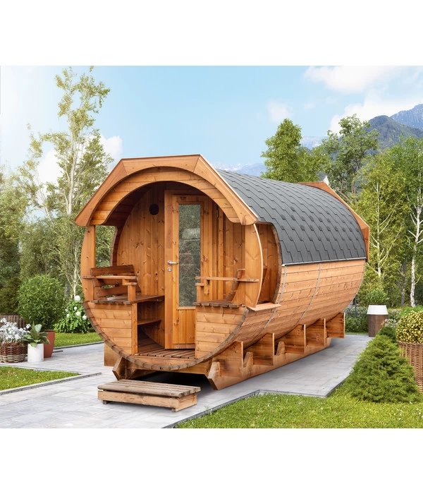 Schon die Römer wussten, dass der Kälte-/Wärme-Reiz des Saunierens positive Effekte auf Körper und Geist hat und gerade im 21. Jahrhundert ist das Bedürfnis nach dieser besonderen Art von Wellness besonders groß. Das Non-Plus-Ultra aber ist es, wenn man eine eigene Sauna im Garten hat. Und dafür brauchen Sie nicht mal ein besonders großes Grundstück, denn originelle Saunafässer wie das Wolff Finnhaus Saunafass Premium Svenja 2 Bausatz Thermoholz braucht nur wenig mehr 6 m². Ohne dass Sie beim Saunieren auf etwas verzichten müssen. Bei diesem kompakten Modell sind die Saunabänke U-förmig angeordnet, so dass Sie zwischen Sitzen und Liegen wählen können. Und haben Sie fürs erste genug geschwitzt und verlassen die Saunakabine, können Sie sich auf der überdachten Terrasse an der frischen Luft entspannen. Entscheiden Sie sich für das Wolff Finnhaus Saunafass Premium Svenja 2 Bausatz Thermoholz – und Sie sind Ihrem Saunaglück ein ganzes Stück nähergekommen!