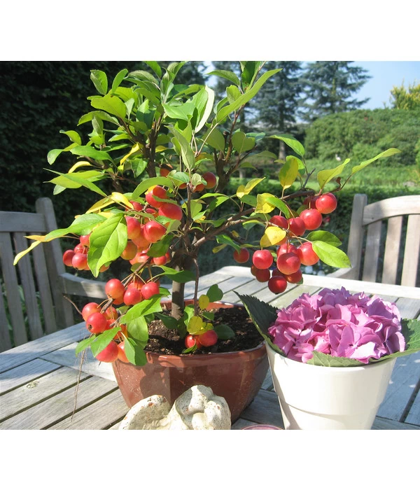 Vielen anderen Ziergehölzen gelingt nur einmal pro Saison ein großer Auftritt im Gartengeschehen, doch der Zierapfel ist in der Lage, Ihre Aufmerksamkeit mindestens zweimal pro Jahr zu fesseln. Im Mai/Juni schmückt er sich mit einem so überreichen Flor aus weißen, rosafarbenen oder kirschroten Blüten, dass es andere Ziersträucher in Ihrem Garten schwer haben, ebenfalls bemerkt zu werden. Über den Sommer tritt der Zierapfel etwas in den Hintergrund, erfreut aber trotzdem mit seinem ebenmäßigen, aufrechten Wuchs, der eine Höhe von 200-300 cm erreichen kann. Im Herbst aber feiert er sein atemberaubendes Comeback und hat sich dafür mit vielen kleinen Zieräpfeln herausgeputzt, die in allen Facetten von Gelbgrün, Orange bis Rot leuchten. Lassen Sie einen dieser hübschen Zieräpfel-Gehölze bei Ihnen einziehen, die wir wie einen “Bonsai“ in eine Schale gepflanzt haben. So können Sie – zumindest in den ersten Jahren – von Nahem beobachten, wie sich die leuchtenden Äpfelchen oft bis in den Januar am Baum festhalten und den winterlichen Garten schmücken.